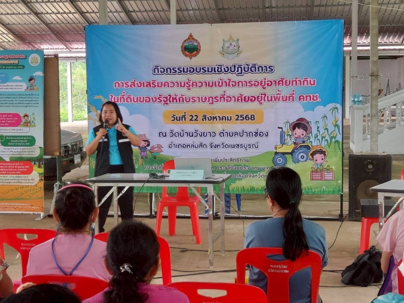 เมื่อวันที่ 22 สิงหาคม 2568 นายพงศธร ศรีชัย สหกรณ์จังหวัดเพชรบูรณ์ มอบหมาย นางสาวมณีวรรณ ปลัดท้วม ผู้อำนวยการกลุ่มส่งเสริมและพัฒนาธุรกิจสหกรณ์ สำนักงานสหกรณ์จังหวัดเพชรบูรณ์ พร้อมบุคลากรกลุ่ม ร่วมเป็นวิทยากรบรรยายในกิจกรรมการอบรมเชิงปฏิบัติการ การส่งเสริมความรู้ความเข้าใจการอยู่อาศัยทำกินในที่ดินของรัฐให้ราษฎรที่อาศัยอยู่ในพื้นที่ คทช. ณ วัดบ้านวังยาว ตำบลปากช่อง อำเภอหล่มสัก จังหวัดเพชรบูรณ์ โดยมีเกษตรกรสมาชิก สหกรณ์การเกษตร คทช.ป่าลุ่มน้ำป่าสักฝั่งซ้าย จำกัด เข้าร่วมอบรมสร้างการรับรู้ มีความเข้าใจในแนวทางการใช้ประโยชน์ในพื้นที่ คทช.