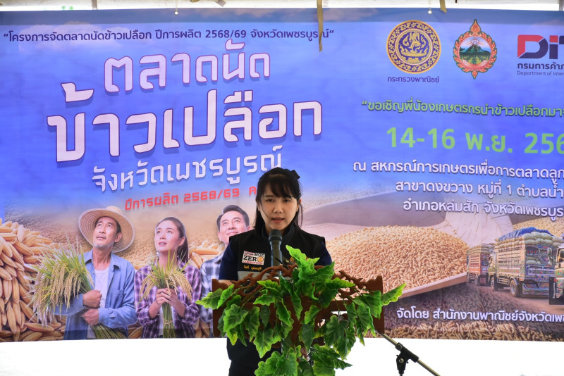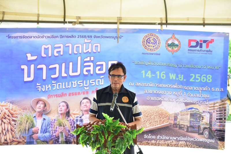 วันที่ 14 พฤศจิกายน 2568 นายพงศธร ศรีชัย สหกรณ์จังหวัดเพชรบูรณ์ พร้อมด้วยกลุ่มส่งเสริมและพัฒนาธุรกิจสหกรณ์ ร่วมโครงการจัดตลาดนัดข้าวเปลือกจังหวัดเพชรบูรณ์ ปีการผลิต 2568/69 จังหวัดเพชรบูรณ์ โดยผู้ว่าราชการจังหวัดเพชรบูรณ์ มอบหมายให้นายสุพล ศรีทับทิม พาณิชย์จังหวัดเพชรบูรณ์ เป็นประธานในพิธีเปิด มีคณะทำงานโครงการฯเข้าร่วมกิจกรรม การเปิดจุดตลาดนัดข้าวเปลือกดังกล่าว มีวัตถุประสงค์เพื่อให้เกษตรกรสมาชิกในพื้นที่มีจุดจำหน่ายผลผลิตข้าวเปลือก ที่มีเครื่องชั่งได้มาตรฐาน ให้ราคาที่ยุติธรรม โดยดำเนินโครงการระหว่างวันที่ 14-16 พฤศจิกายน 2568 ณ สหกรณ์การเกษตรเพื่อการตลาดลูกค้า ธ.ก.ส.เพชรบูรณ์ จำกัด (สาขาดงขวาง) ตำบลน้ำชุน อำเภอหล่มสัก จังหวัดเพชรบูรณ์
